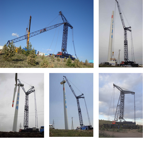 由我公司自主研发的第二台风电专用吊机於2009年5月交付现场使用,於山西左云风电项目由天津电建公司克服了恶劣的路面环境顺利完成现场吊装任务,第二台风电吊机起升高度可达90米,最大吊重可达80吨(15m处),可满足1.5~2.0兆kw风电机组吊装要求。
