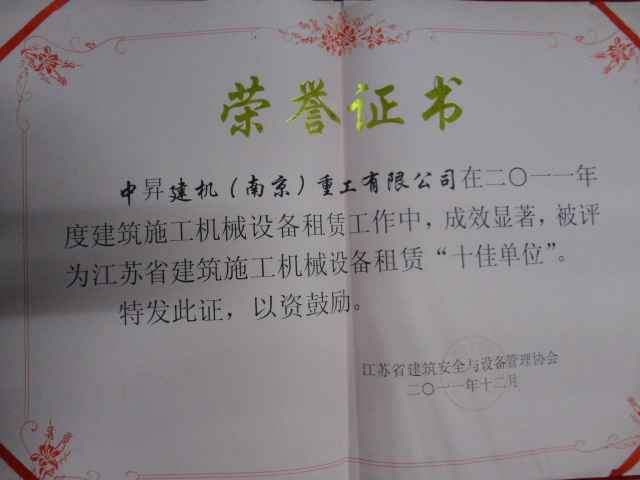 中昇建机被评为2011年度江苏省建筑施工机械设备租赁“十佳单位”