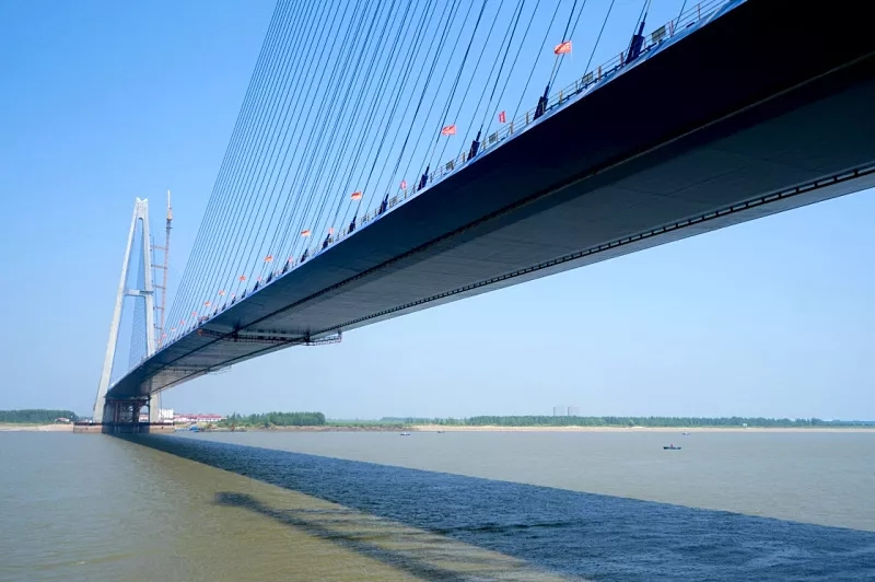 全长7548米的青山长江大桥,主跨达938米,是武汉四环线跨越长江的控制性工程之一,也是武汉市的第11座长江大桥。桥面比武汉沌口长江大桥还宽两米,成为目前跨越长江桥面最宽的桥梁。