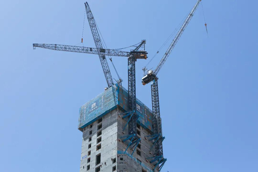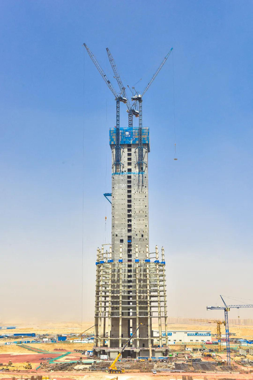 非洲第一高楼——埃及新首都CBD标志塔施工建设中共有ZSL380、ZSL850和ZSL1700三台动臂塔吊投入使用,三台动臂塔吊扮演着不可或缺的角色。此次ZSL380和ZSL850动臂塔吊高空移位爬升的同时,ZSL1700动臂塔吊完成第八次内爬顶升。