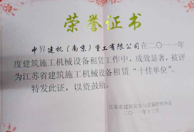 中昇建机被评为2011年度江苏省建筑施工机械设备租赁“十佳单位”