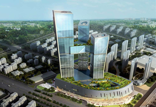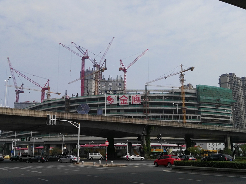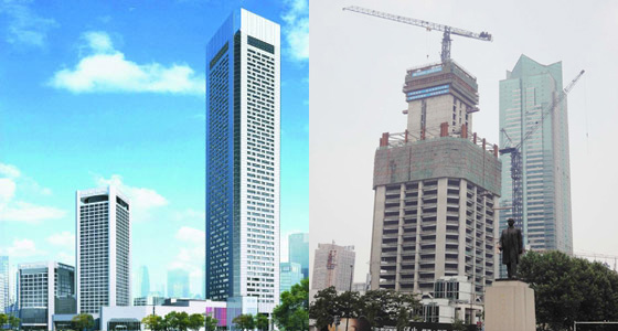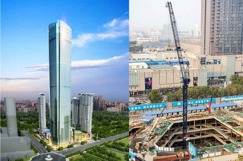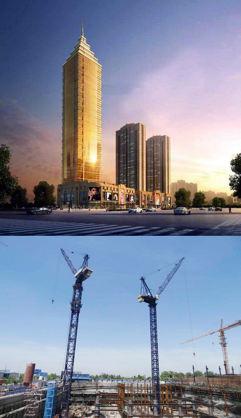 大楼高度208米,采用中昇建机ZSL1000一台(最大吊重64t)和ZSL750一台(最大吊重50t)。