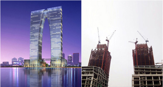 施工高度323米,采用中昇建机ZSL500两台(最大吊重32t)